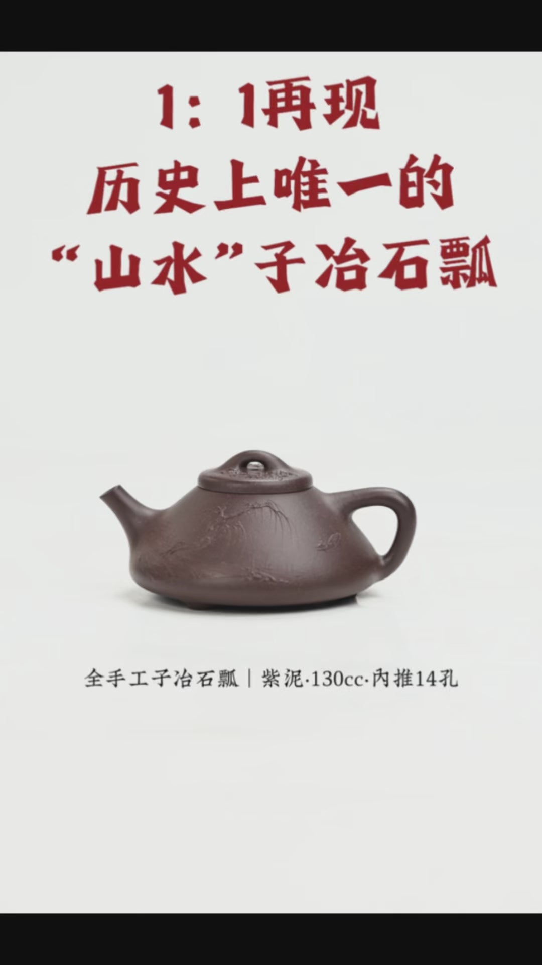 再現歷史上唯一一款,清代瞿子冶裝飾的,“山水”子冶石瓢,由澄堂紫器品牌創始人強益鋮製作,以本色泥繪方式再現風采,黃龍山紫泥制,130cc,內推14孔出水。